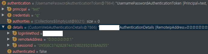 해당 WebAuthenticationDetails 객체는 일종의 VO역할을 하는듯 싶다.