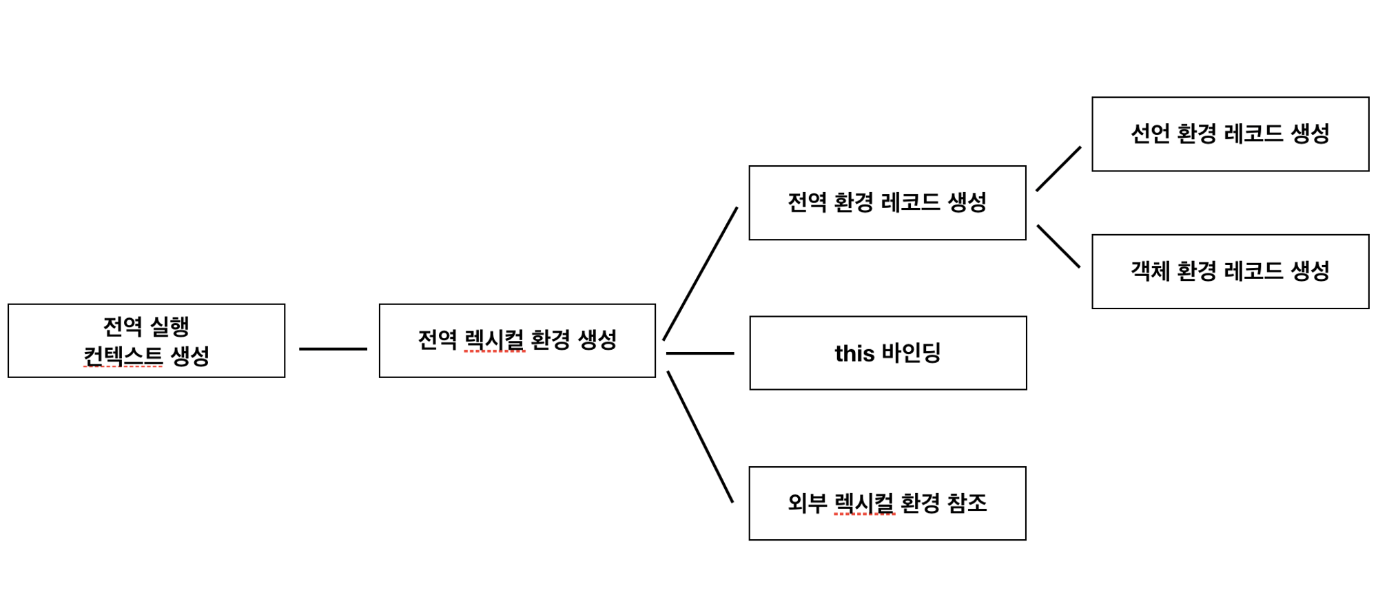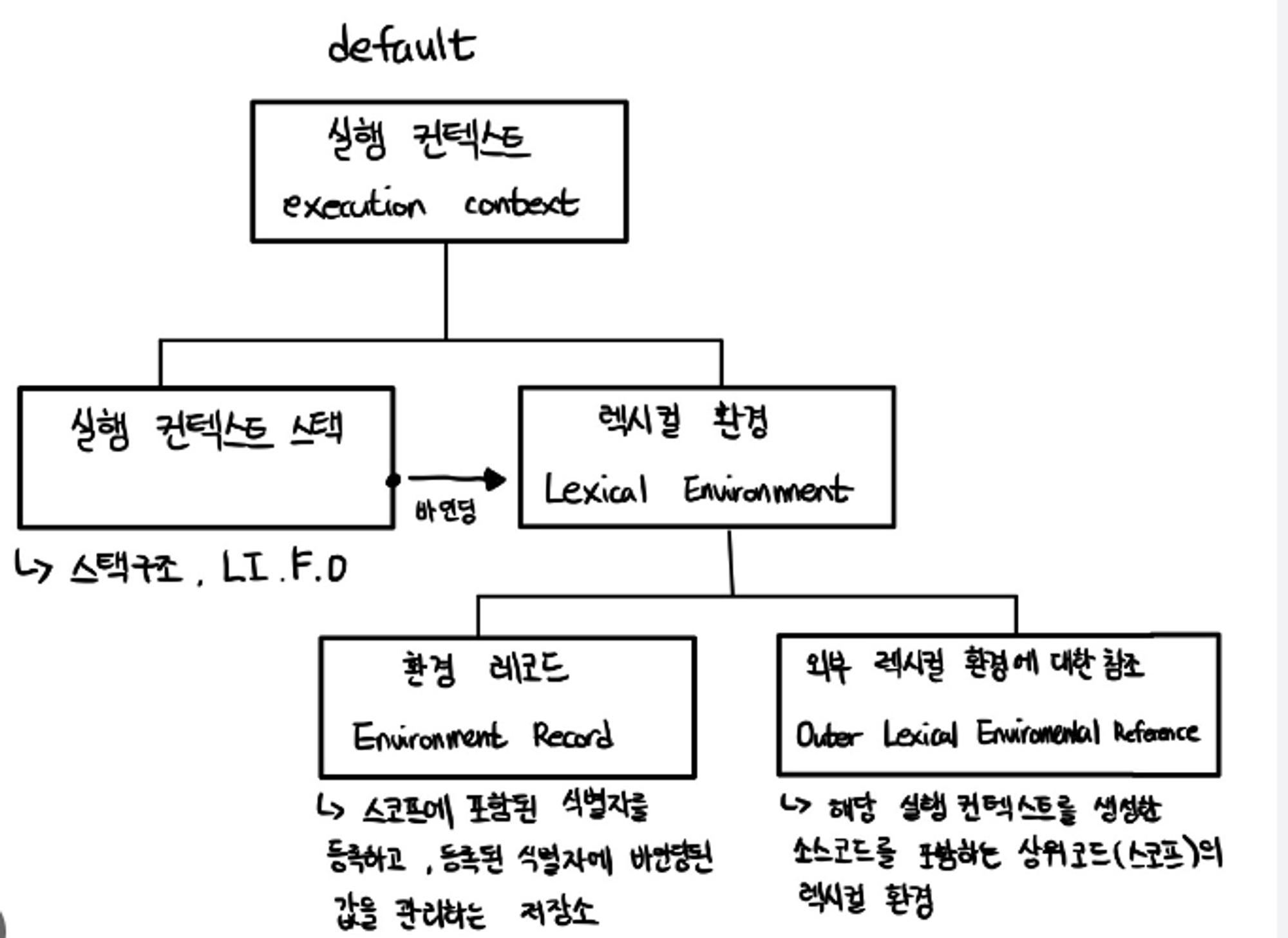 - 평가 : 실행 컨텍스트를 생성하고 변수, 함수 등의 선언문만 먼저 실행한다. 생성된 변수/함수 식별자를 실행 컨텍스트가 관리하는 스코프에 등록한다.